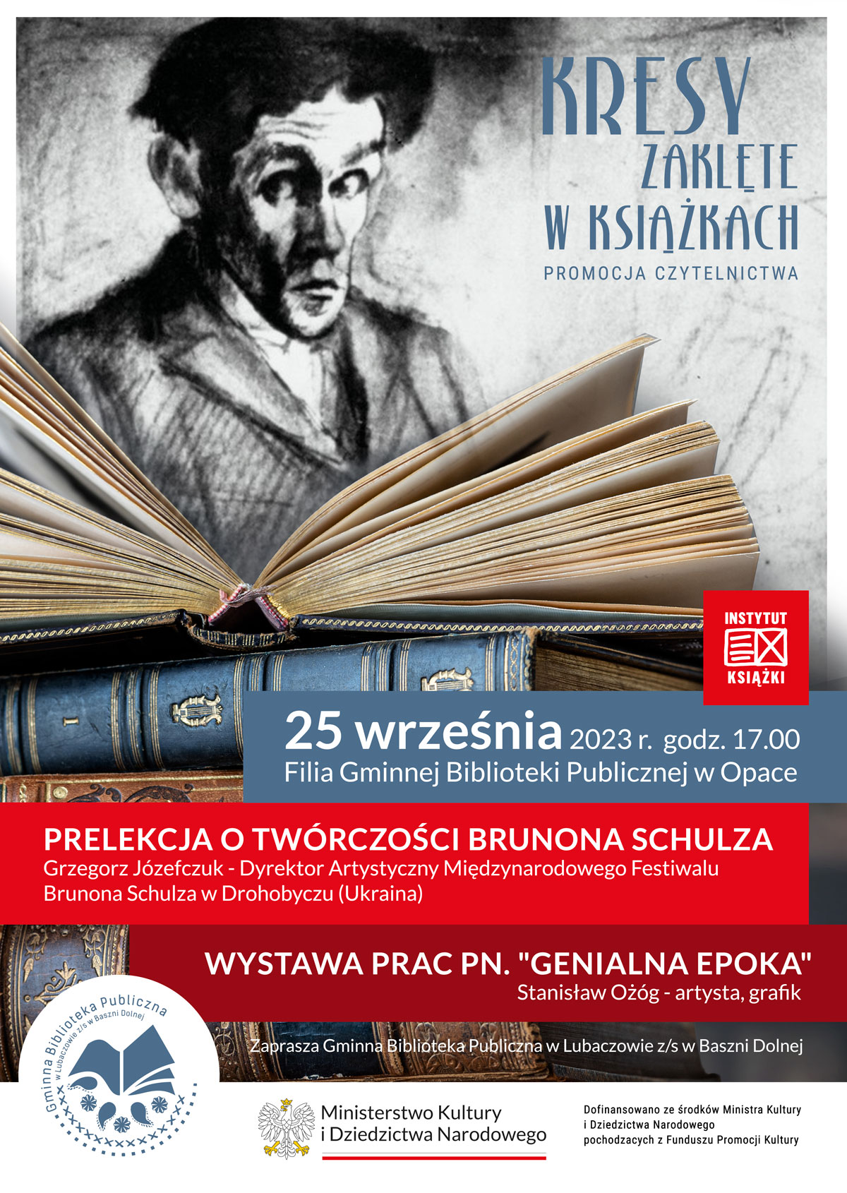 Gminna Biblioteka Publiczna w Lubaczowie z/s w Baszni Dolnej, w ramach realizacji projektu pn. „Kresy zaklęte w książkach”, serdecznie zaprasza do udziału w spotkaniu o twórczości Brunona Schulza, którą poprowadzi Pan Grzegorz Józefczuk – Dyrektor Artystyczny Międzynarodowego Festiwalu Brunona Schulza w Drohobyczu (Ukraina) oraz w wystawie plastycznej pn. „Genialna epoka” Pana Stanisława Ożoga – grafika, malarza.