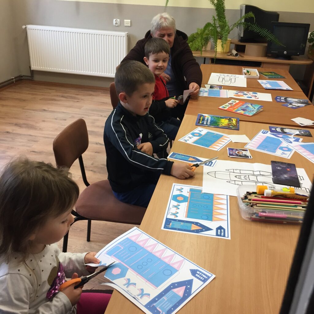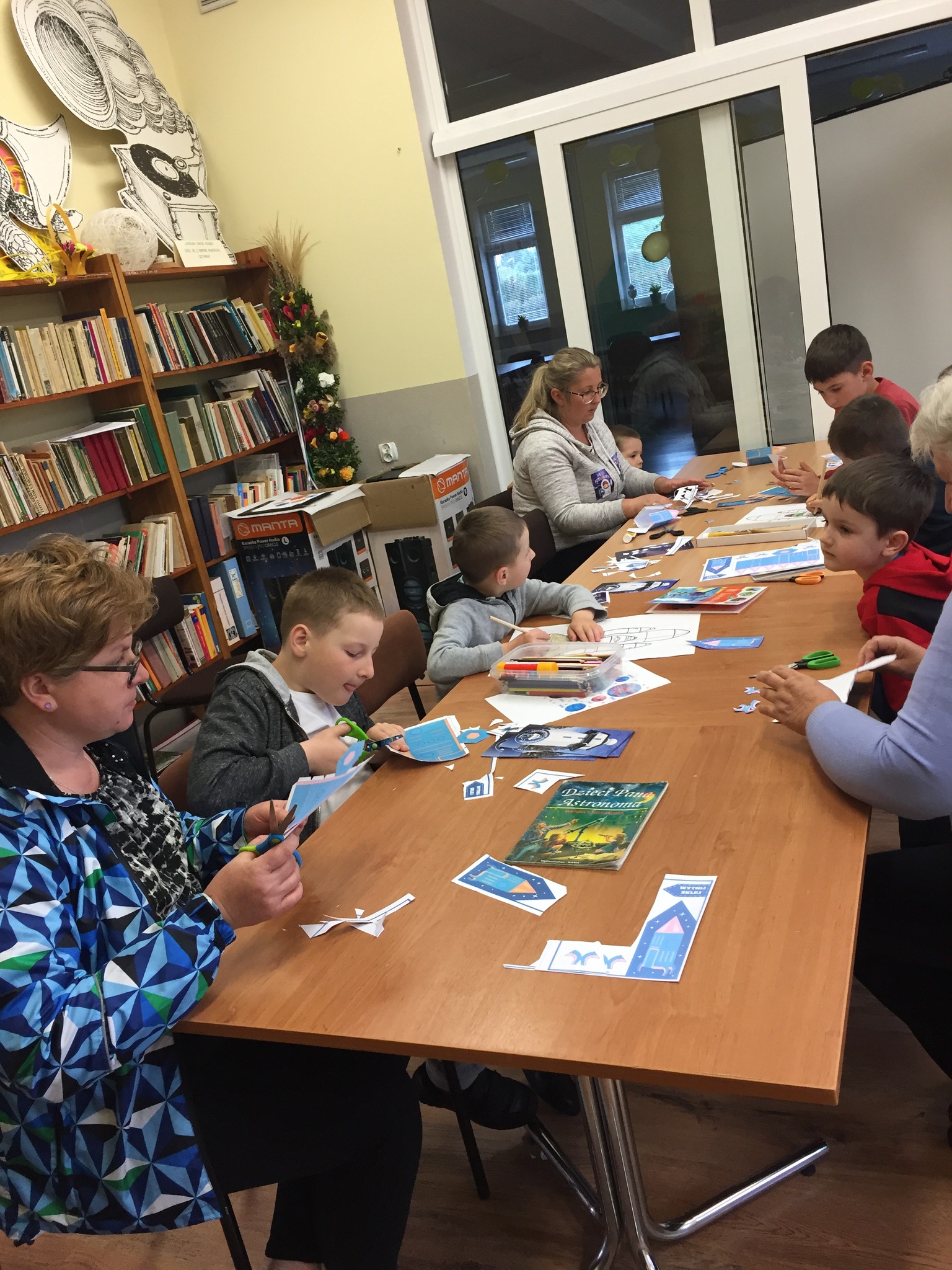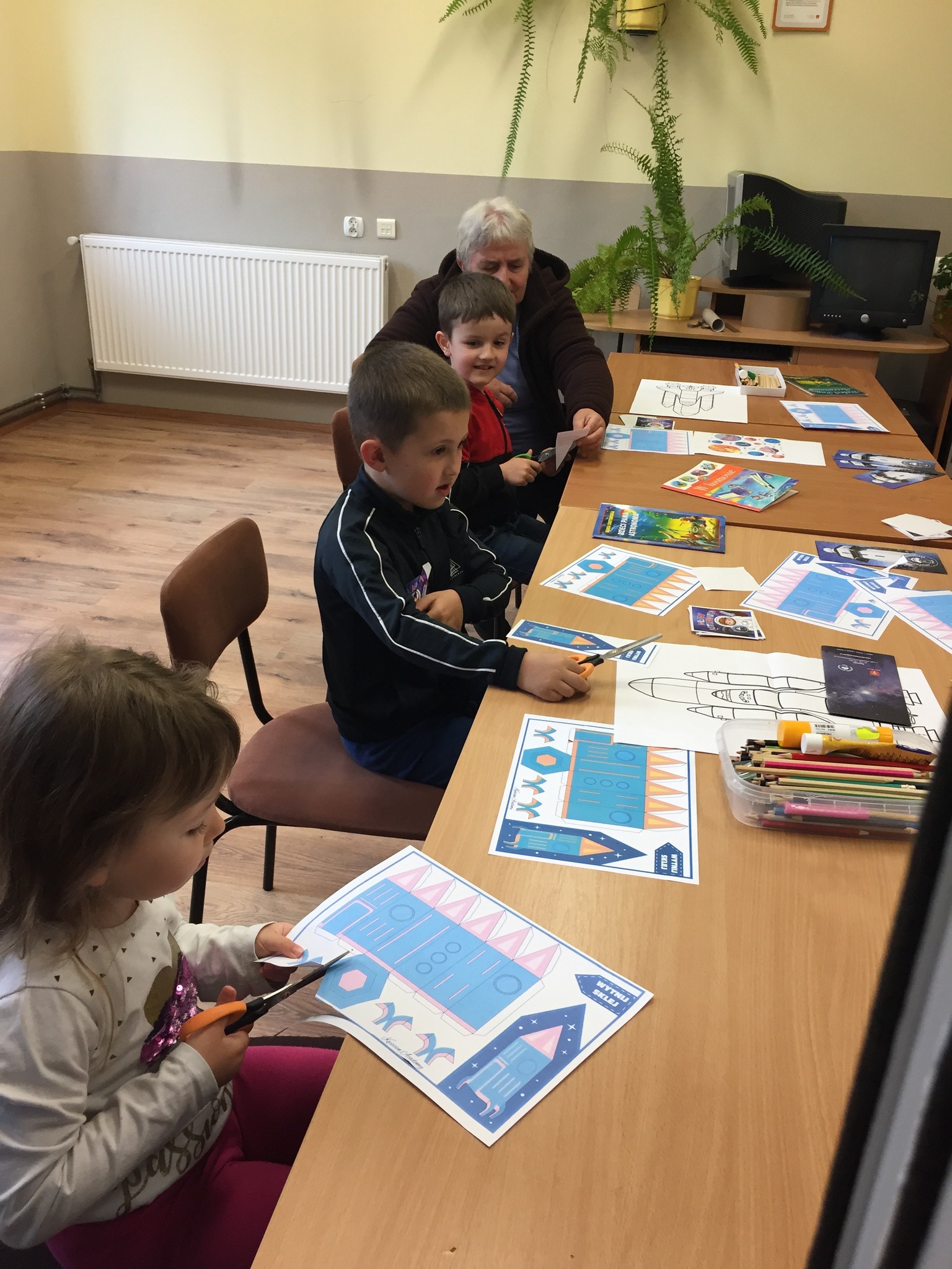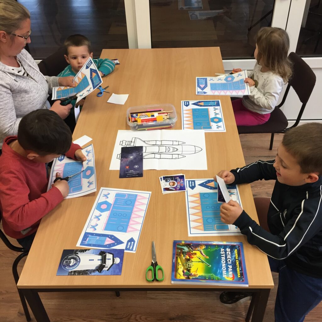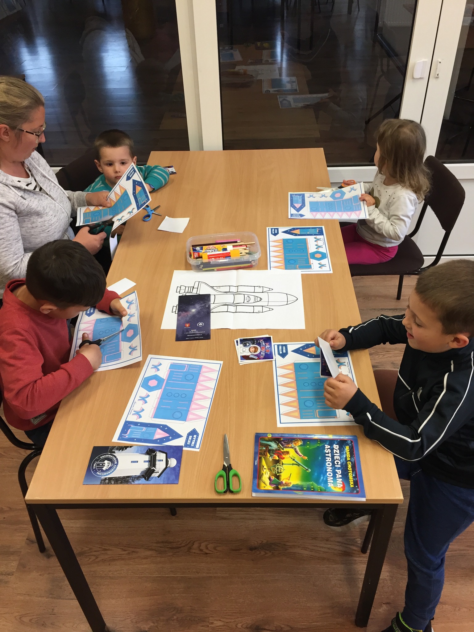 Z wielkim zaangażowaniem i przy pomocy dorosłych każdy z uczestników wykonał swój model na piątkę. W trakcie warsztatów słuchały opowieści o kosmosie i podróżach kosmicznych. Dzieci po tych opowieściach wyznały swoje marzenia o locie w kosmos. Każde z nich wyraziło chęć zostać Astronautą. Wysłuchały również fragmentów książki ,,Dzieci Pana Astronoma”, i kilku ciekawostek o kosmosie i układzie słonecznym.