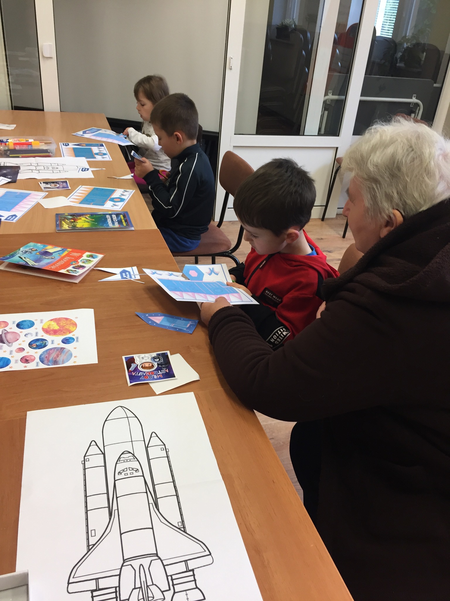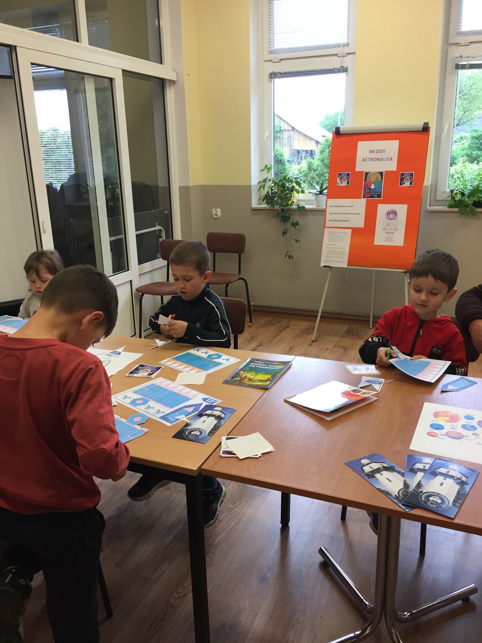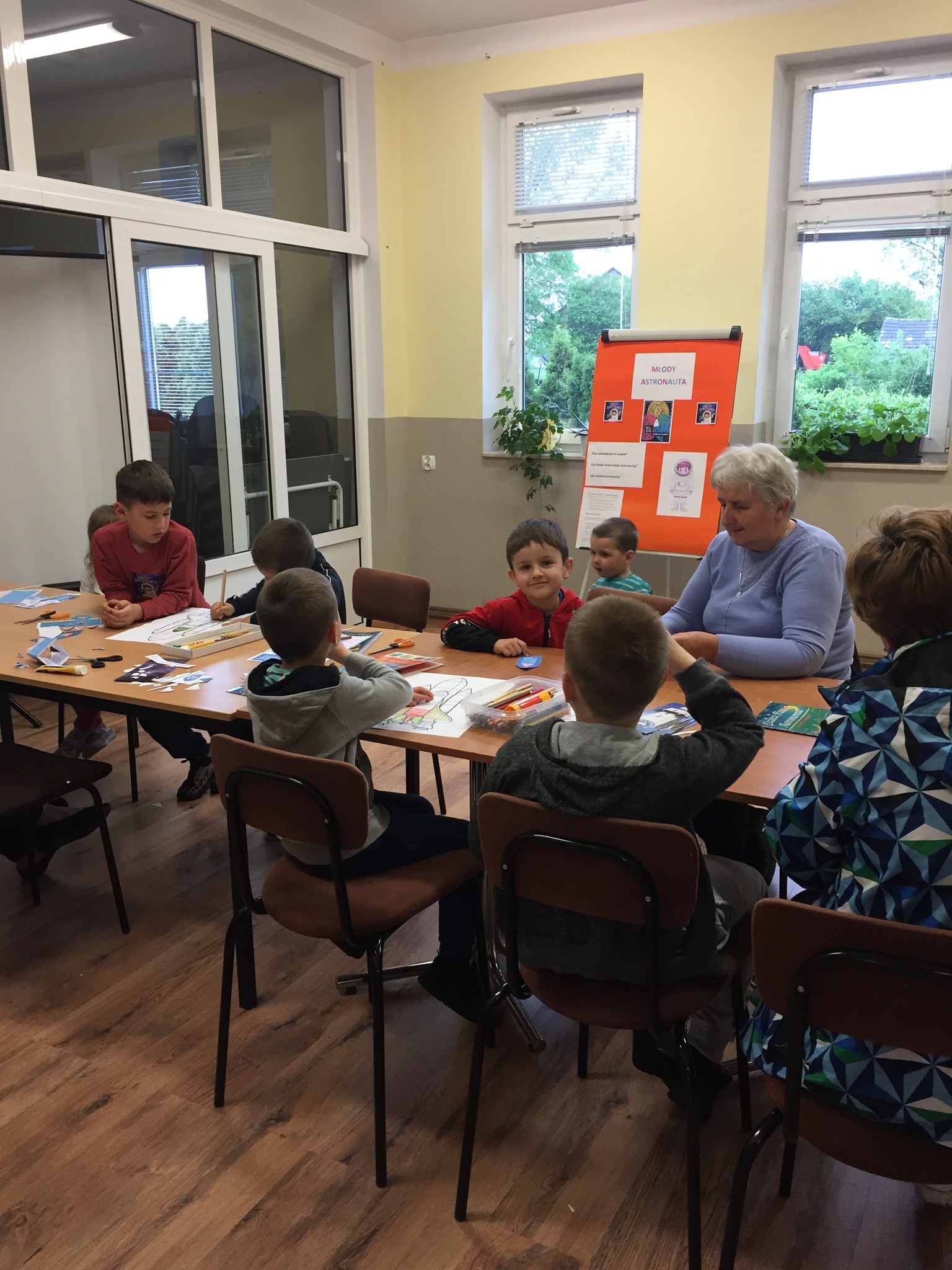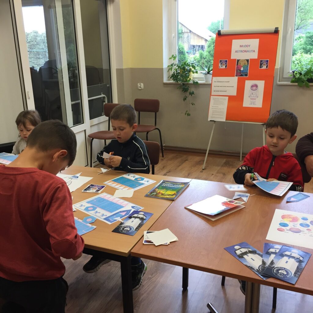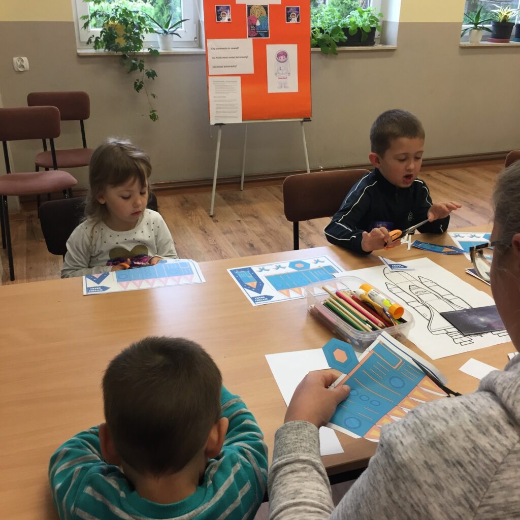 Z wielkim zaangażowaniem i przy pomocy dorosłych każdy z uczestników wykonał swój model na piątkę. W trakcie warsztatów słuchały opowieści o kosmosie i podróżach kosmicznych. Dzieci po tych opowieściach wyznały swoje marzenia o locie w kosmos. Każde z nich wyraziło chęć zostać Astronautą. Wysłuchały również fragmentów książki ,,Dzieci Pana Astronoma”, i kilku ciekawostek o kosmosie i układzie słonecznym.