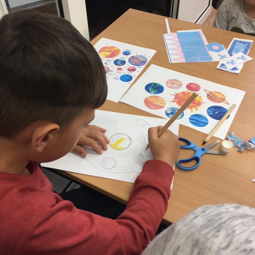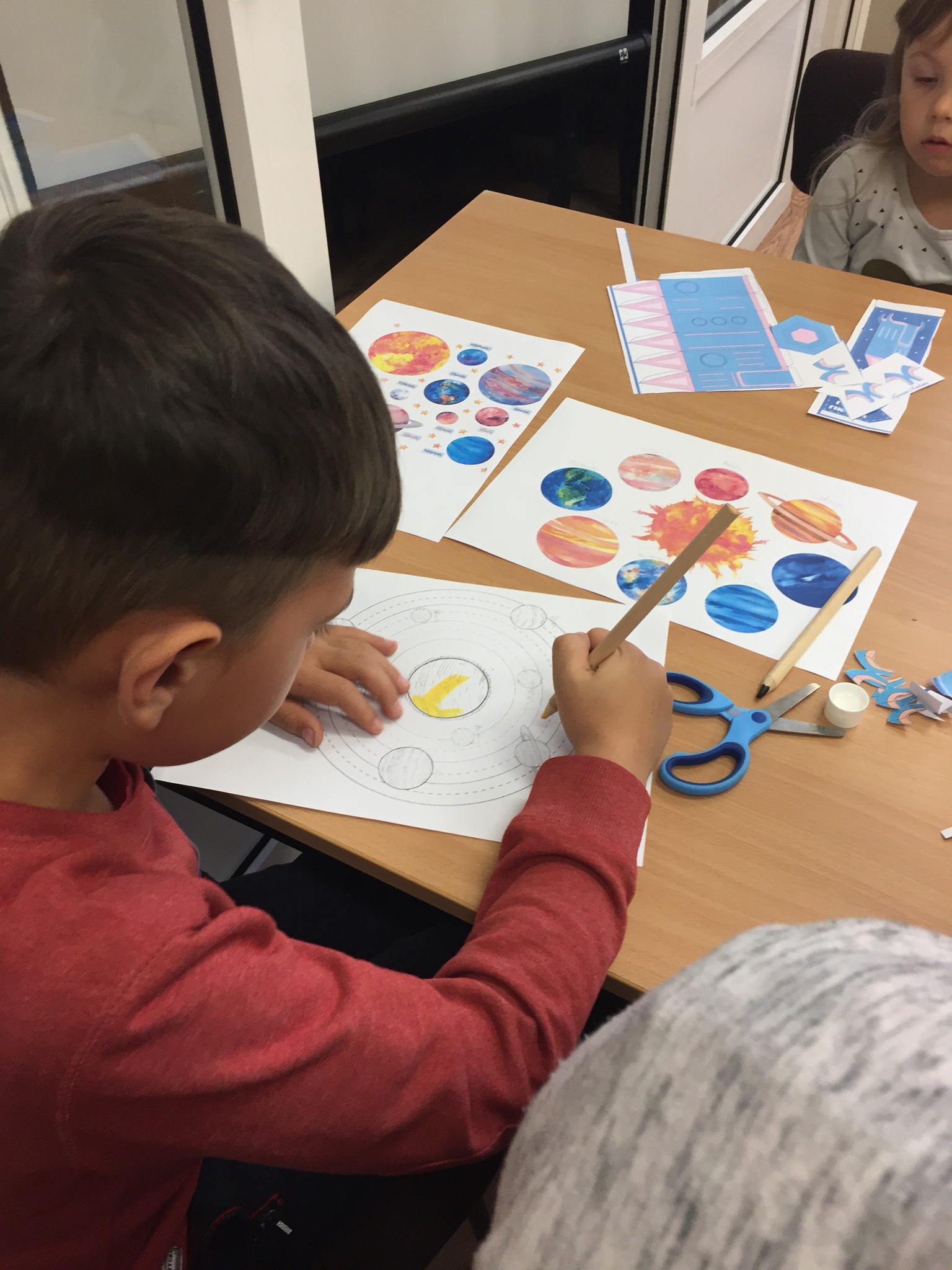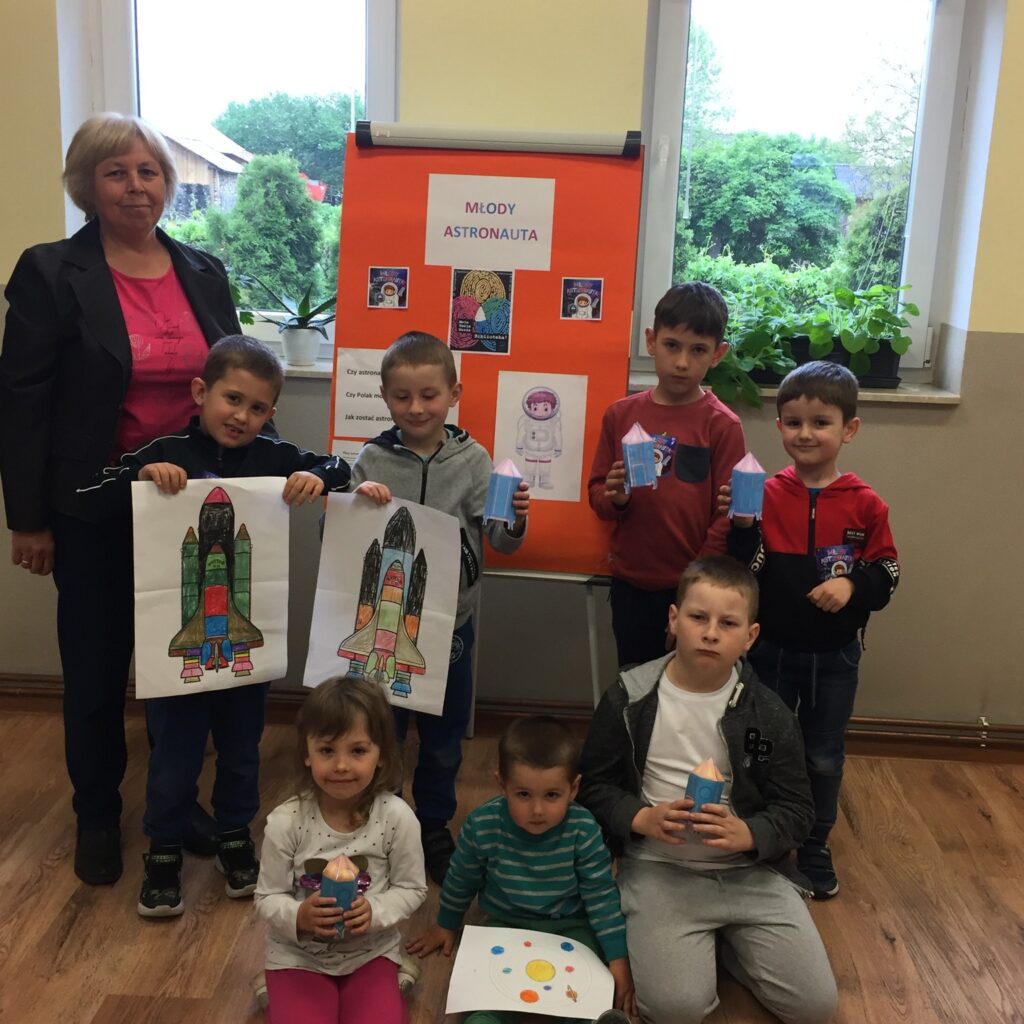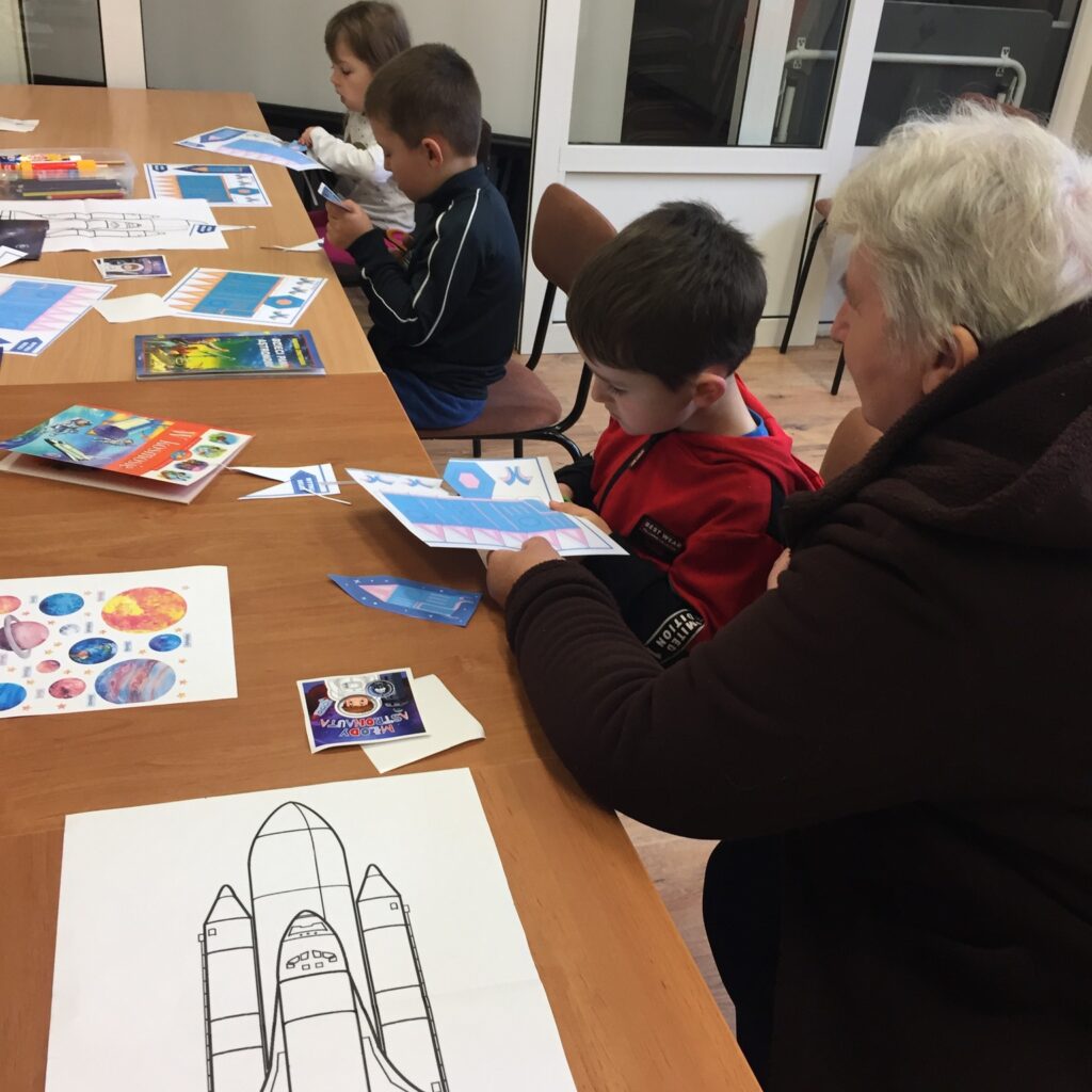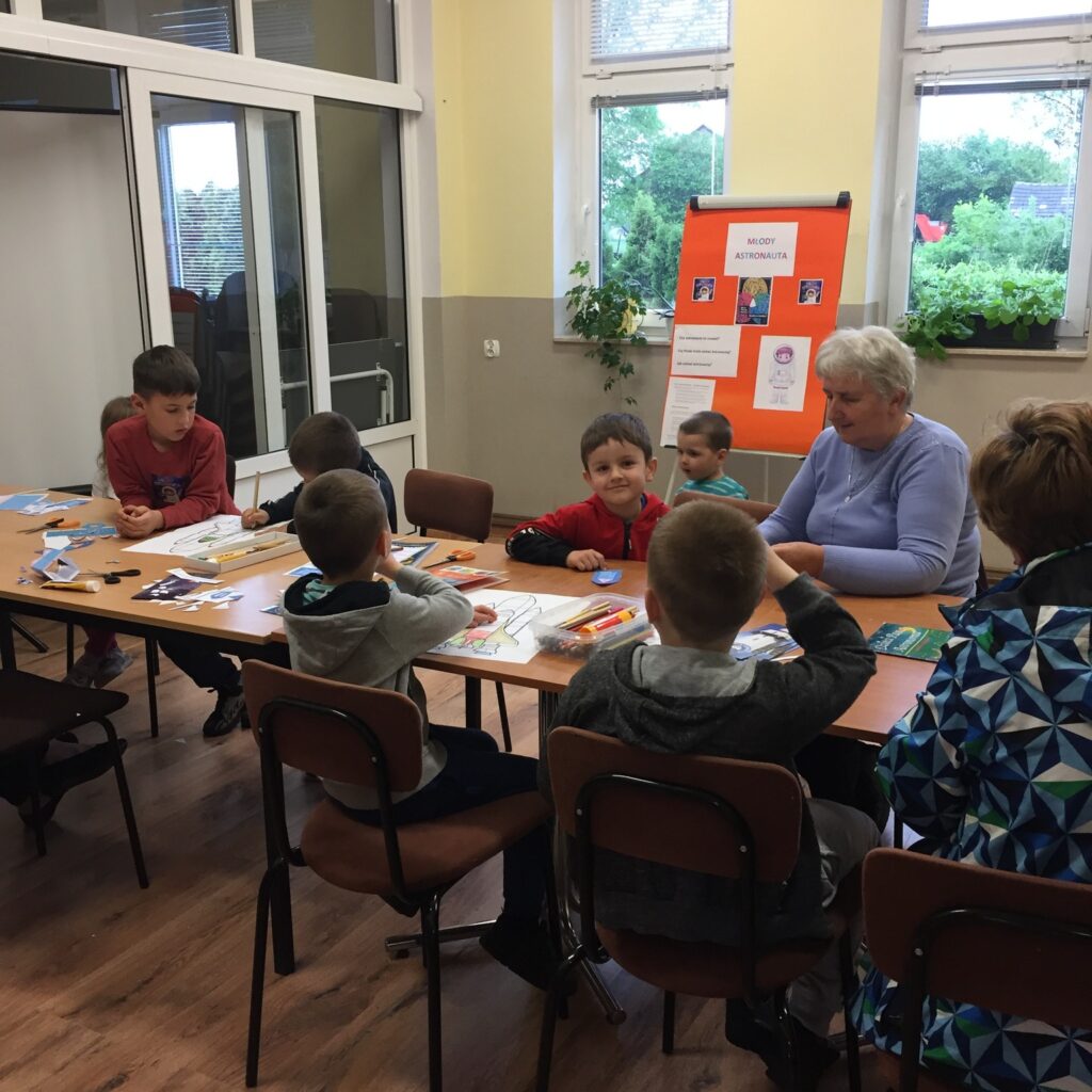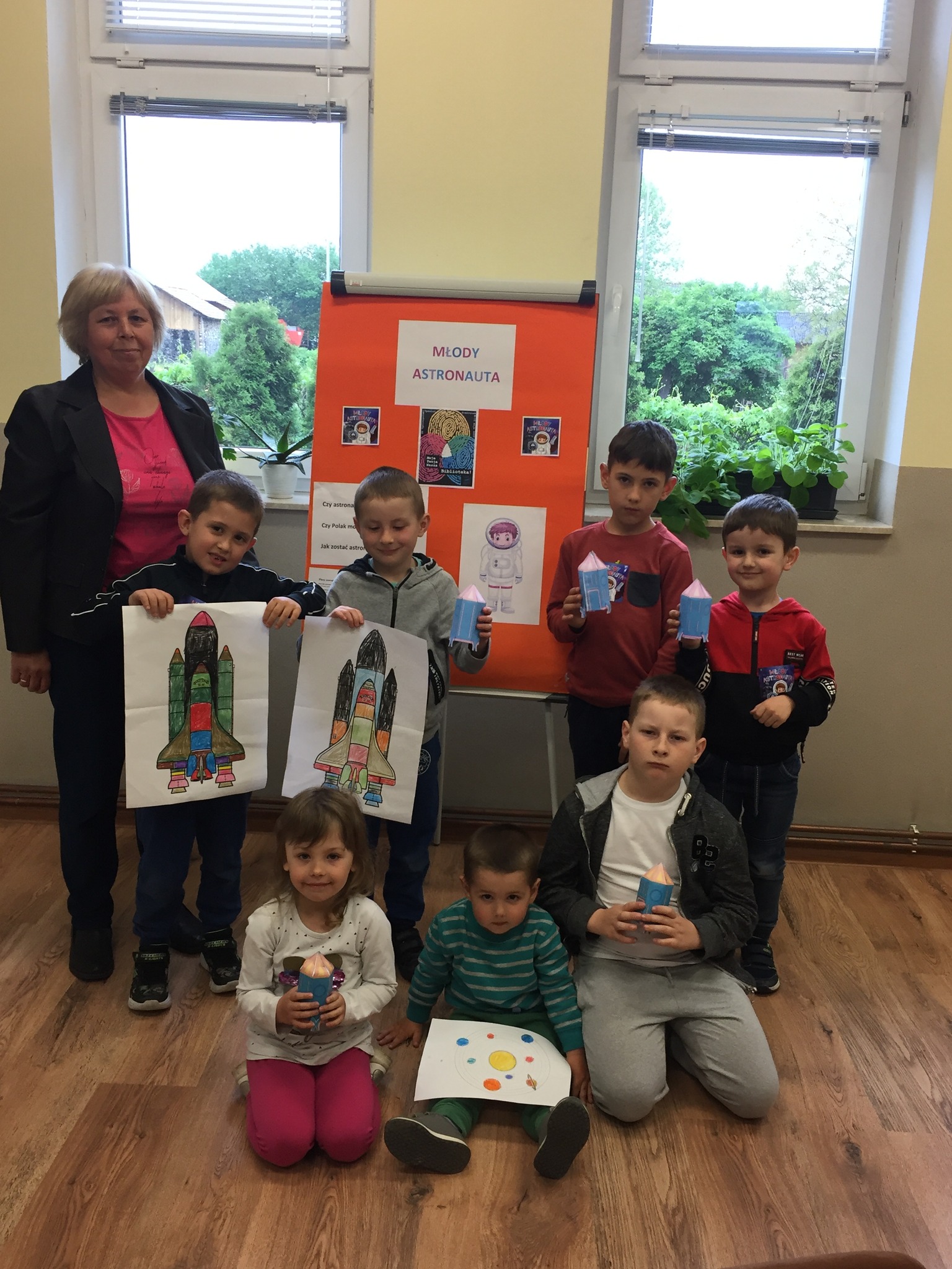 Z wielkim zaangażowaniem i przy pomocy dorosłych każdy z uczestników wykonał swój model na piątkę. W trakcie warsztatów słuchały opowieści o kosmosie i podróżach kosmicznych. Dzieci po tych opowieściach wyznały swoje marzenia o locie w kosmos. Każde z nich wyraziło chęć zostać Astronautą. Wysłuchały również fragmentów książki ,,Dzieci Pana Astronoma”, i kilku ciekawostek o kosmosie i układzie słonecznym.