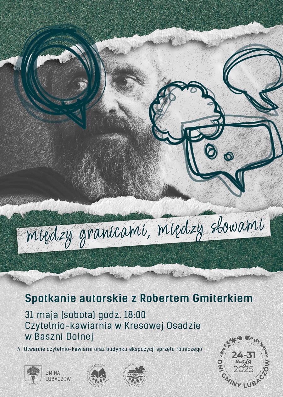Gminna Biblioteka Publiczna w Lubaczowie z siedzibą w Baszni Dolnej zaprasza na wyjątkowe spotkanie autorskie z Robertem Gmiterkiem – pisarzem, podróżnikiem i pasjonatem Kresów. Wydarzenie odbędzie się w sobotę, 31 maja 2025 r. o godz. 18:00 w Czytelniokawiarni w Kresowej Osadzie.